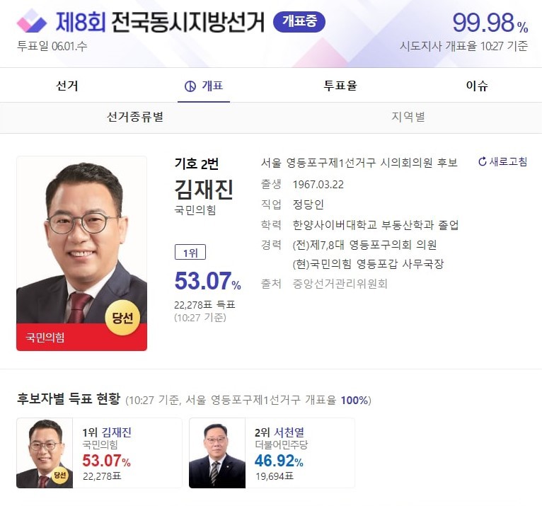 [세계타임즈 백진욱 기자] 국민의 힘 김재진 후보가 제 8회 전국동시지방선거 서울 영등포구제1선거구에서 시의회의원으로 당선됐다.