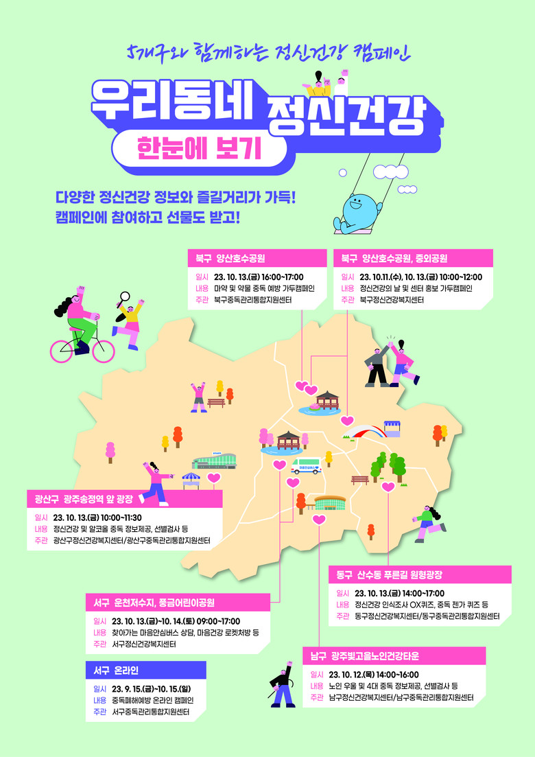 광주시는 9일부터 20일까지를 정신건강주간으로 정하고 ▲1010 걷기 챌린지 ▲만족도 조사 이벤트 ▲정신질환 인식개선 퀴즈풀이 등 기념이벤트를 펼친다. 또 5개 자치구별로 ‘우리동네 정신건강 캠페인’을 진행, 정신건강 정보와 함께 정신건강 상담 및 선별검사, 마음안심버스 운영 등 다양한 체험거리를 제공한다.