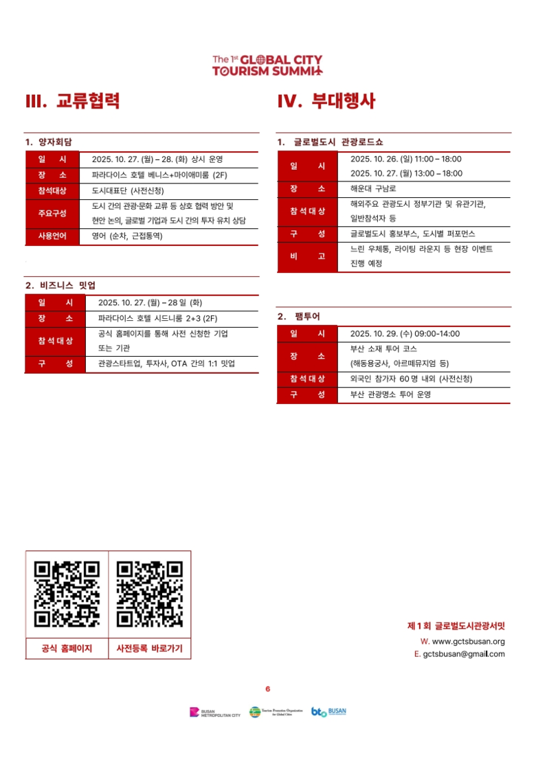 시는 국제기구 글로벌도시관광진흥기구(TPO)와 함께 이번 서밋을 통해 도시 간 관광 협력의 새로운 방향을 제시하고, ‘글로벌 관광허브도시 부산’ 실현을 위한 중장기 관광정책 비전을 모색할 예정이다.
