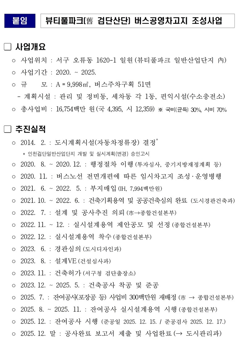 뷰티풀파크 버스공영차고지는 대규모 개발사업으로 증가하는 서구 검단지역의 대중교통 수요에 대응하고, 버스 노선의 안정적이고 효율적인 운영을 지원하기 위해 2020년부터 추진해 온 교통 인프라 구축 사업이다.