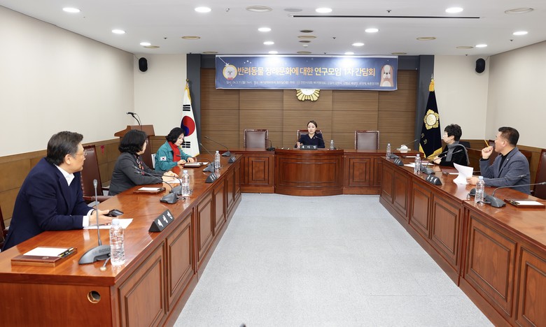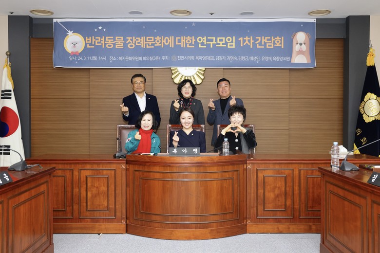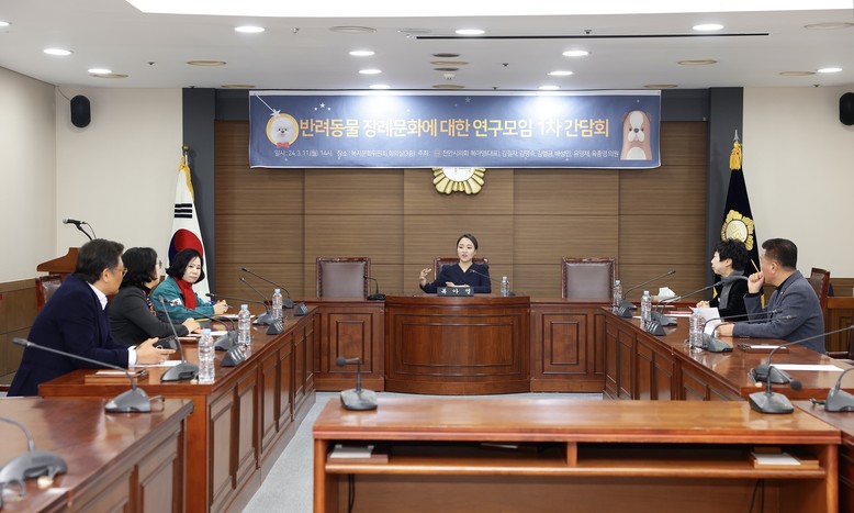 [천안시 세계타임즈=백택기 기자] 「반려동물 장례문화에 대한 연구모임 (복아영(대표), 김길자, 김명숙, 김행금, 배성민, 유영채, 육종영 의원)」은 11일 천안시의회 복지문화위원회 회의실에서 천안시 반려동물의 장례문화에 관한 제도적 장치 마련을 위해 1차 간담회를 가졌다.