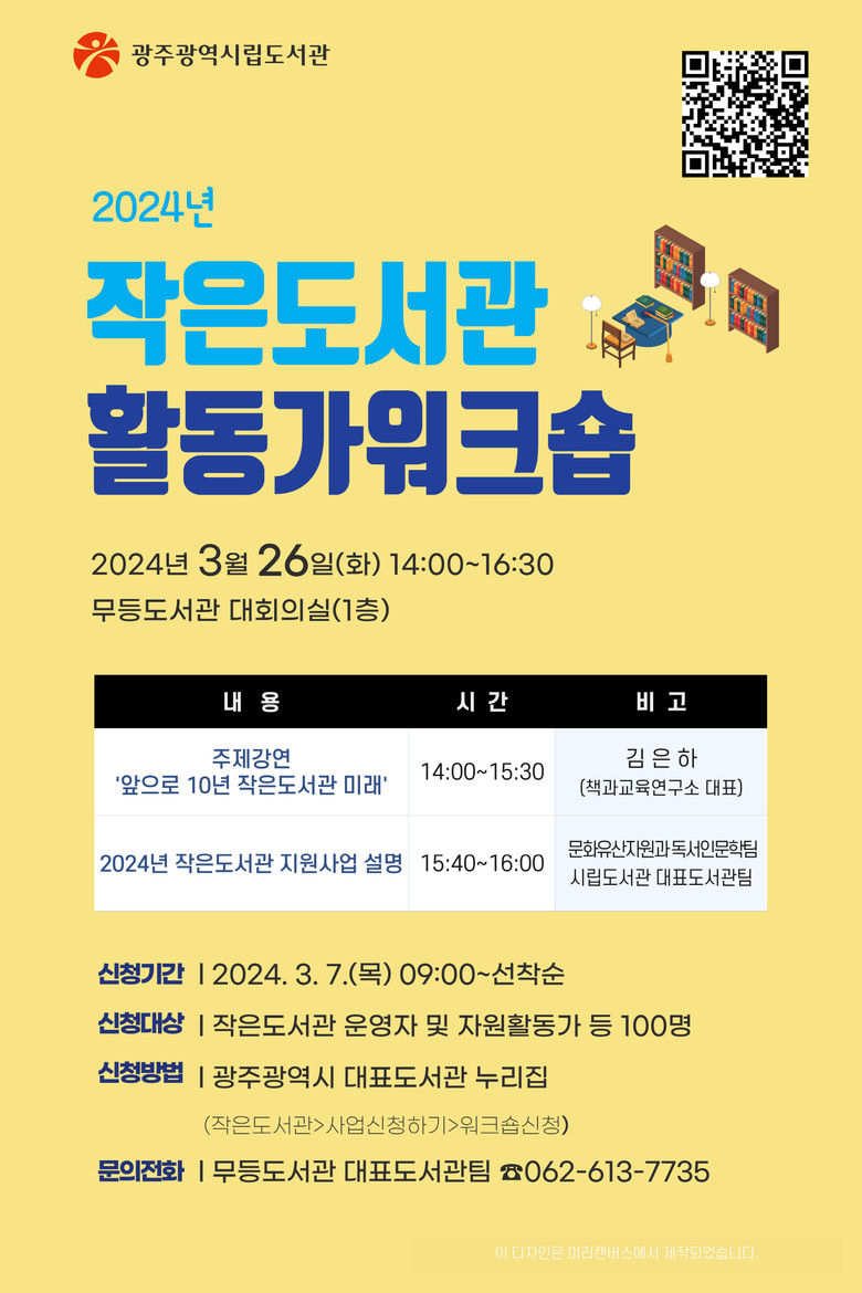 참여는 작은도서관 활동가라면 누구나 가능하며 광주시 대표도서관 누리집(https://lib.gwangju.kr/rpst)을 통해 신청하면 된다.