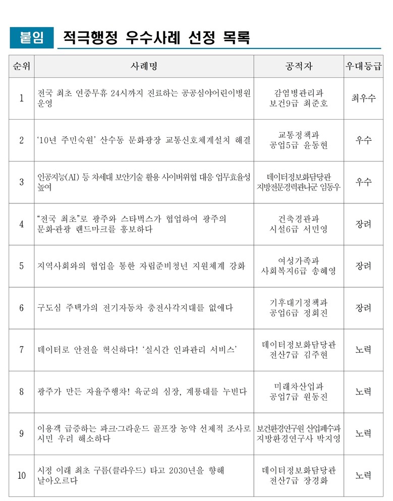 광주광역시(시장 강기정)는 지난 7일 시청에서 제3차 광주광역시 적극행정위원회를 열고 시민이 체감할 수 있는 성과를 창출해 적극행정 문화 확산에 기여한 적극행정 우수공무원 10명(우수사례 10개)을 선정했다.