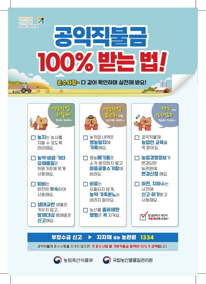 기본형 공익직불제는 농업·농촌의 공익적 기능을 증진하고 농업인의 소득 안정을 도모하기 위한 제도로, 직불금을 100% 지급받기 위해서는 법령에서 정한 16가지 준수사항을 모두 이행해야 한다.
