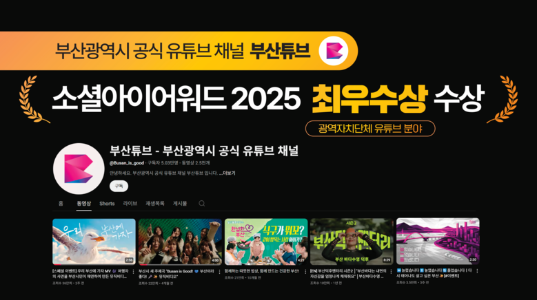 ◈ 이번 수상을 계기로 ▲현장감 있는 브이로그형 콘텐츠 ▲정책 체감형 인터뷰 영상 ▲시민 참여 프로젝트 등을 추진해 시민과의 양방향 소통을 강화할 계획 [부산 세계타임즈=이용우 기자] 부산시(시장 박형준)는 시 공식 유튜브 채널 '부산튜브'가 「2025 소셜아이어워드」 광역자치단체 유튜브 부문에서 최우수상을 받았다고 밝혔다.
