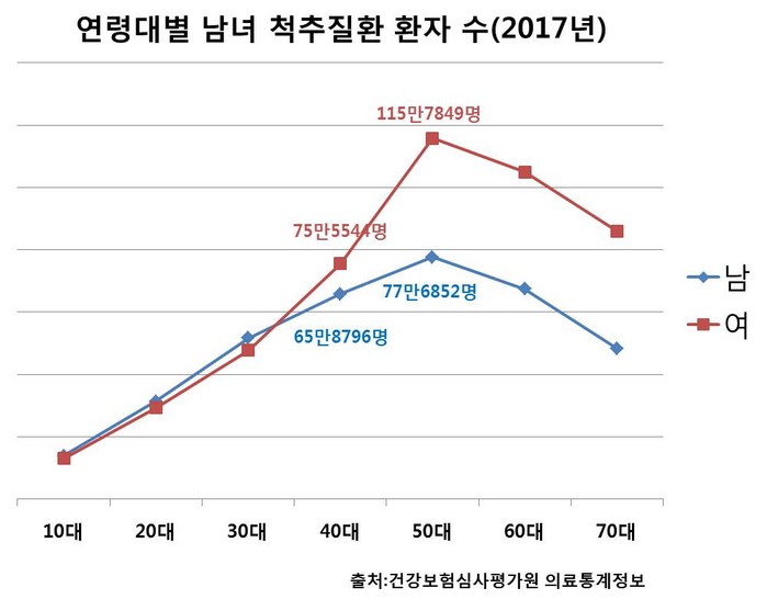 | ▲연령대별 남녀 척추질환 환자 수(2017년) |