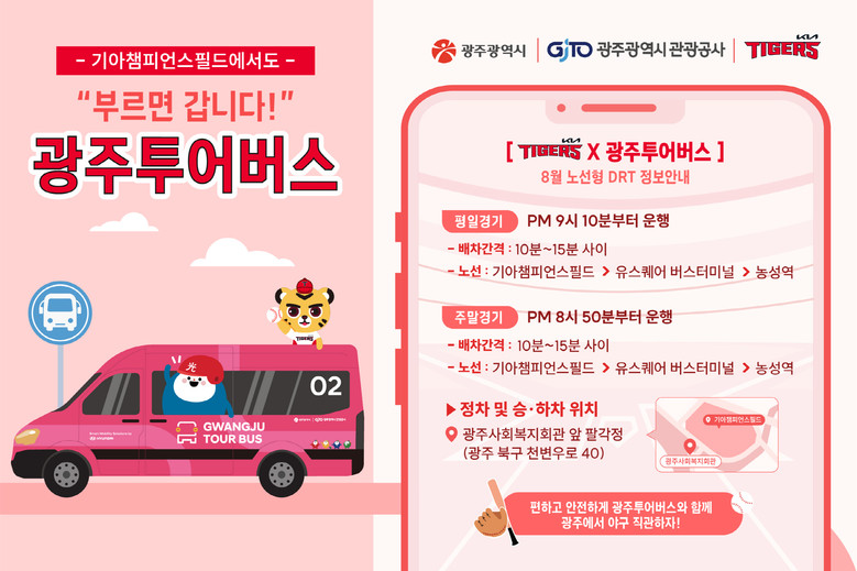 광주광역시(시장 강기정)는 이용객이 원하는 정류장에서 앱으로 호출하면 찾아오는 ‘광주투어버스’의 정류장에 기아챔피언스필드를 8일부터 추가하고, 기아 타이거즈 구단과 협업해 각종 홍보와 이벤트를 추진한다.