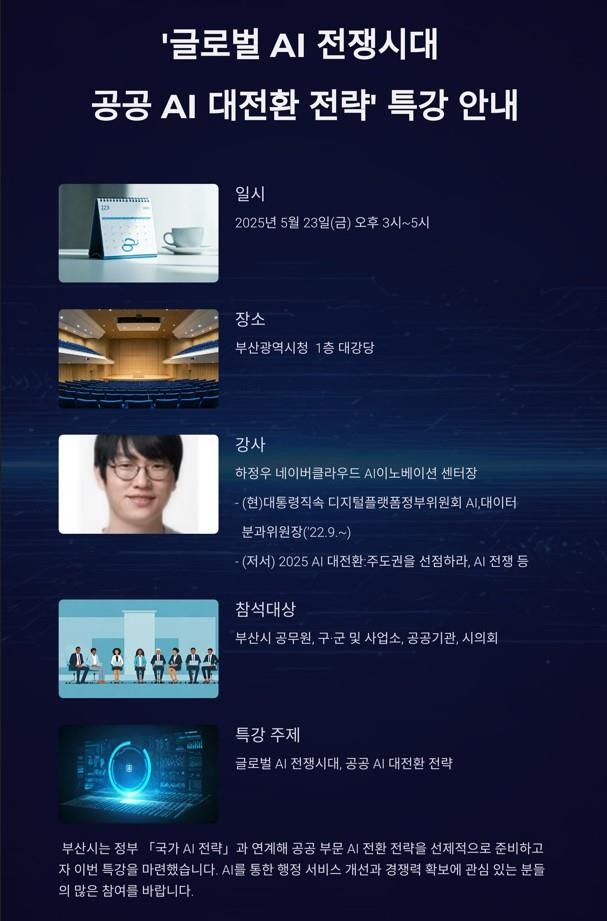 한편, 시는 오는 5월 23일 오후 3시 시청 대강당에서 '공공행정 인공지능(AI)혁신 선도'를 주제로, 하정우 네이버클라우드 인공지능(AI)이노베이션 센터장을 초청해 『글로벌 인공지능(AI) 전쟁시대, 공공 인공지능(AI) 대전환 전략』 특강을 개최할 예정이다.
