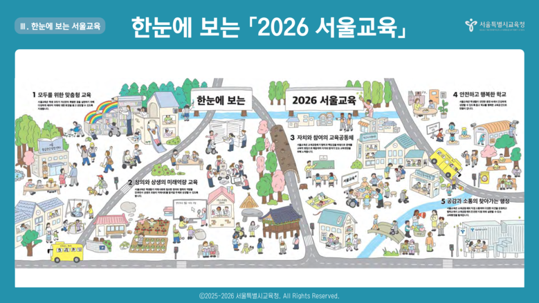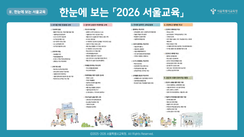 서울시교육청은 2025년 학생 마음건강, 대입제도, 독서교육, AI교육 등 미래 변화에 선제적으로 대응하기 위한 종합 계획을 추진해 왔으며, 현장에서 축적된 성과와 성찰을 바탕으로 정책의 질적 성장을 이어갈 것이라고 밝혔다. 또한 2026년에도 교육공동체가 함께 성장하는 구조를 만들기 위해 종합적·장기적 관점의 정책을 지속적으로 추진하겠다는 의지를 표명했다.