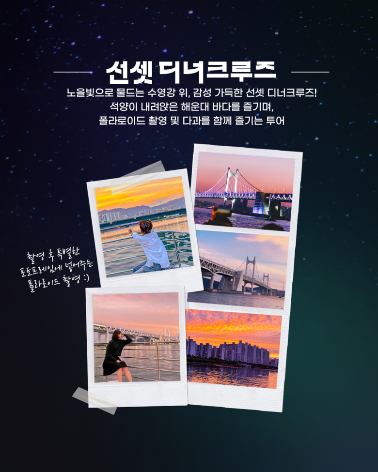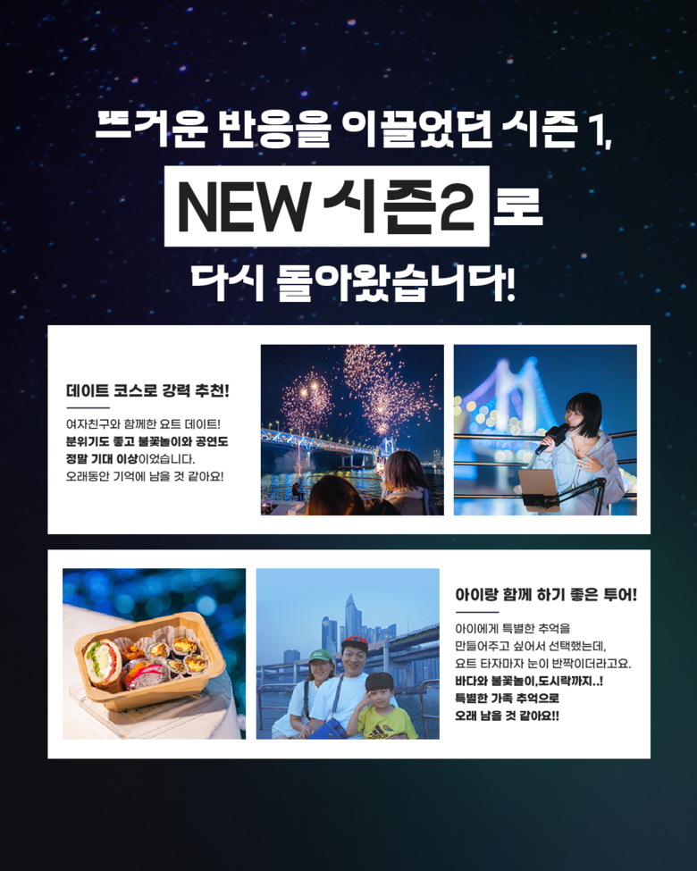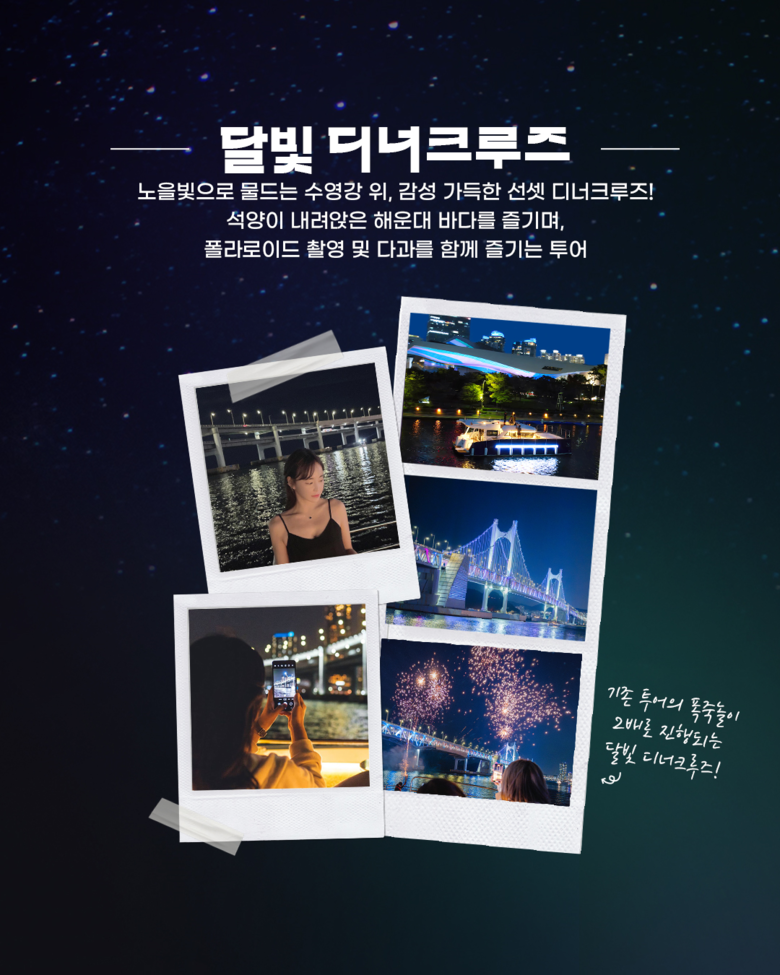 특히, 매주 금요일 ‘달빛디너(야경)’ 시간대에는 바다 위에서 열리는 버스킹 공연 ‘달빛 콘서트’와 광안대교 아래에서 펼쳐지는 불꽃놀이를 함께 즐길 수 있다.