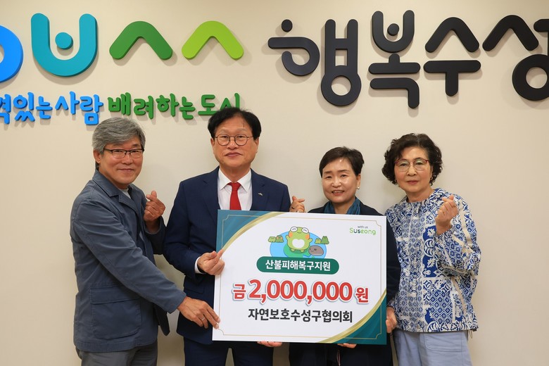 김대권 수성구청장은 “평소 자연보호에 솔선수범하며 지역사회의 귀감이 되어주신 자연보호수성구협의회가 이웃을 위한 나눔에도 앞장서 주셔서 깊이 감사드린다”며 “성금이 피해 지역 주민들에게 큰 힘이 되길 바란다”고 말했다.