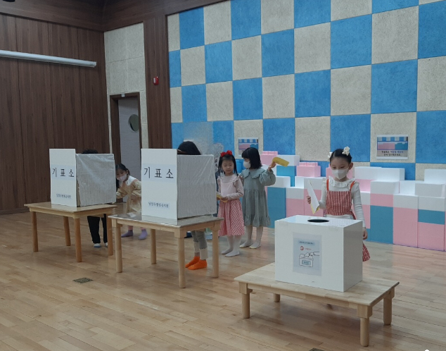 이에 투표 놀이에 앞서 ▲각 학급에서 지원 유아 모집하기 ▲각 학급에서 지원 유아 선서문 낭독하기 ▲우리 학급 후보 유아 2명 선출하기 ▲ 학급 후보 홍보하기(후보 유아 홍보 전단 활용) ▲5세 유아 전체 대상 학급 후보 유아 선서문 낭독하기 등 사전 활동이 진행되었다.