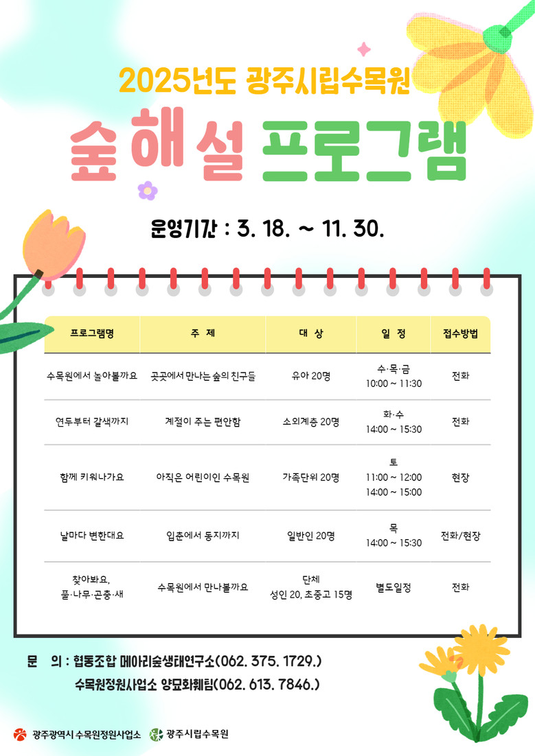 프로그램은 ▲수목원에서 놀아볼까요 ▲연두부터 갈색까지 ▲함께 키워나가요 ▲날마다 변한대요 ▲찾아봐요 풀·나무·곤충·새 등 연령별 맞춤형으로 진행된다. 특히 8월에는 유아와 청소년을 위한 여름방학 특별 프로그램도 운영할 계획이다.