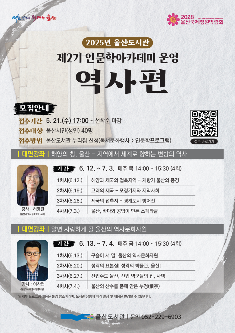 이번 강좌는 강사와의 직접적인 소통과 정기적인 참여 유도를 위해 대면 강좌로 운영되며, ▲‘해양의 창 울산–지역에서 세계로 향하는 변방의 역사’ ▲‘알면 사랑하게 될 울산의 역사문화자원’ 등 2개 강좌로 구성됐다.