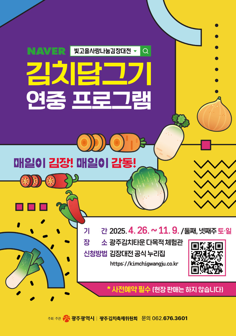 김치 담그기를 희망하는 개인 및 기업·단체는 ‘빛고을 사랑나눔 김장대전’ 공식 누리집(www.kimchigwangju.co.kr) 또는 정보무늬(QR코드)를 통해 사전 신청하면 된다. 다만 김치가격은 원재료 시세를 반영해 매달 달라질 수 있다.