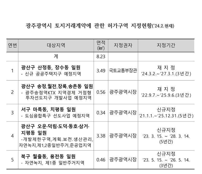 해당 구역이 토지거래허가구역으로 재지정됨에 따라 허가구역 내에서 토지면적 농지 500㎡, 임야 1000㎡, 기타 250㎡를 초과해 거래하면 계약 전 해당 자치단체(광산구)의 토지거래허가를 반드시 받아야 한다.