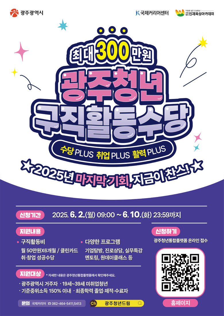 - 청년 구직 위한 역량강화·기업탐방 프로그램도 운영 [광주 세계타임즈=손권일 기자] 광주광역시(시장 강기정)는 ‘광주 청년구직활동수당 지원사업’에 참여할 3차 지원자 300명을 10일까지 모집한다.