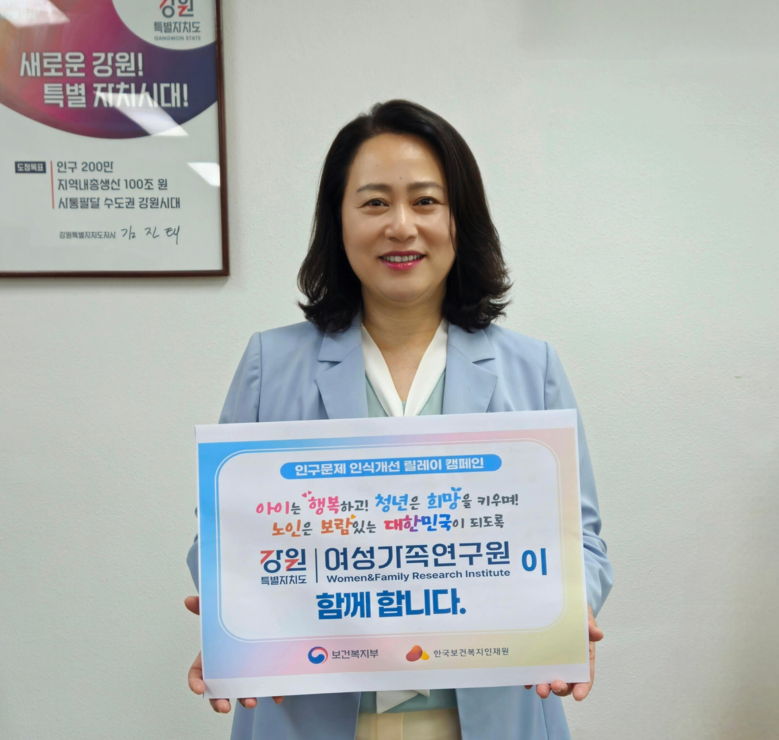 [강원도 세계타임즈=김민석 기자] 강원특별자치도여성가족연구원(원장 김숙영)은 5월 29일(목), 인구감소 및 고령화 문제에 대한 사회적 인식 제고를 위한 ‘인구문제 인식개선 릴레이 캠페인’에 동참했다.