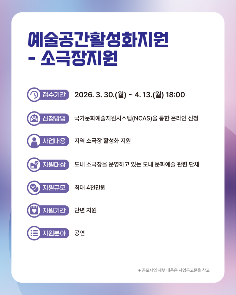 이번 공모는 총 2억 원 규모를 추가로 선정하며, ‘소극장지원’ 사업 뿐 아니라 ‘공간기반 창작지원’사업을 신설해 예술공간과 창작활동을 함께 지원하는 구조로 확대됐다.