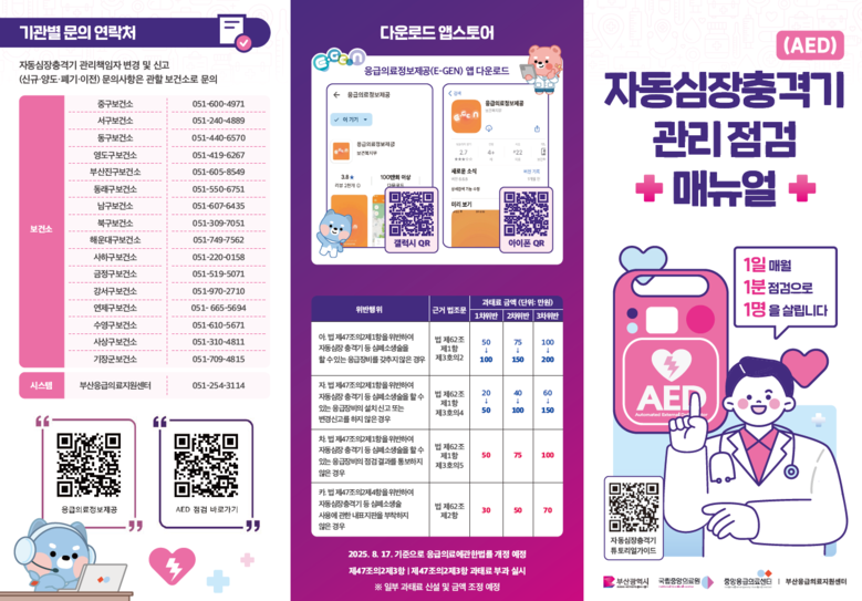 시는 이번 법령 개정 내용을 시민과 관련 기관에 널리 알리기 위해 부산응급의료지원센터와 협업해 홍보 안내문(리플릿) 1천 부를 제작하고 구·군 보건소를 통해 배포했다. 또한, 자동심장충격기(AED) 설치기관을 대상으로 한 교육과 현장 안내를 병행해, 시민 누구나 자동심장충격기(AED)를 신속하게 인식하고 사용할 수 있는 환경 조성에 주력하고 있다.