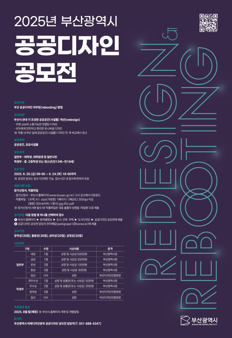 ◈ 2개 부문(일반부, 학생부)으로 나눠 선정 및 시상… 총 1천350만 원 상당의 상금과 상장 수여 [부산 세계타임즈=이용우 기자] 부산시(시장 박형준)는 오는 6월 20일부터 24일까지 '부산 공공디자인 리부팅(rebooting) 탐험'을 주제로 「2025년 부산시 공공디자인 공모전」을 개최한다고 밝혔다.