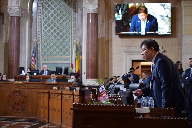 ◈ 안성민 의장, LA시의회 본회의에서 협약 체결 후 시의원, 방청객 대상 연설