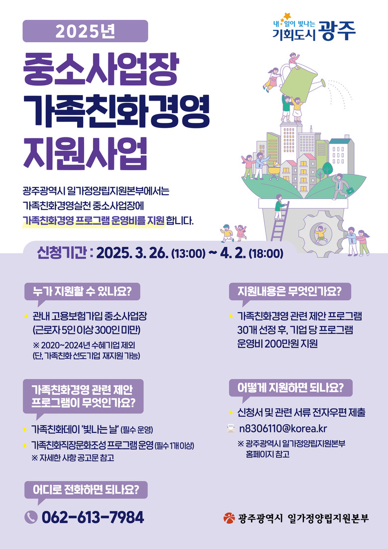신청은 오는 26일(오후 1시)부터 4월 2일(오후 6시)까지 광주시 누리집 공지사항 또는 일가정양립지원본부 누리집 가족친화경영자료실에서 신청서를 내려받아 이메일(n8306110@korea.kr)로 접수하면 된다. 자세한 내용은 일가정양립지원본부로(☎062-613-7984) 문의하면 된다.