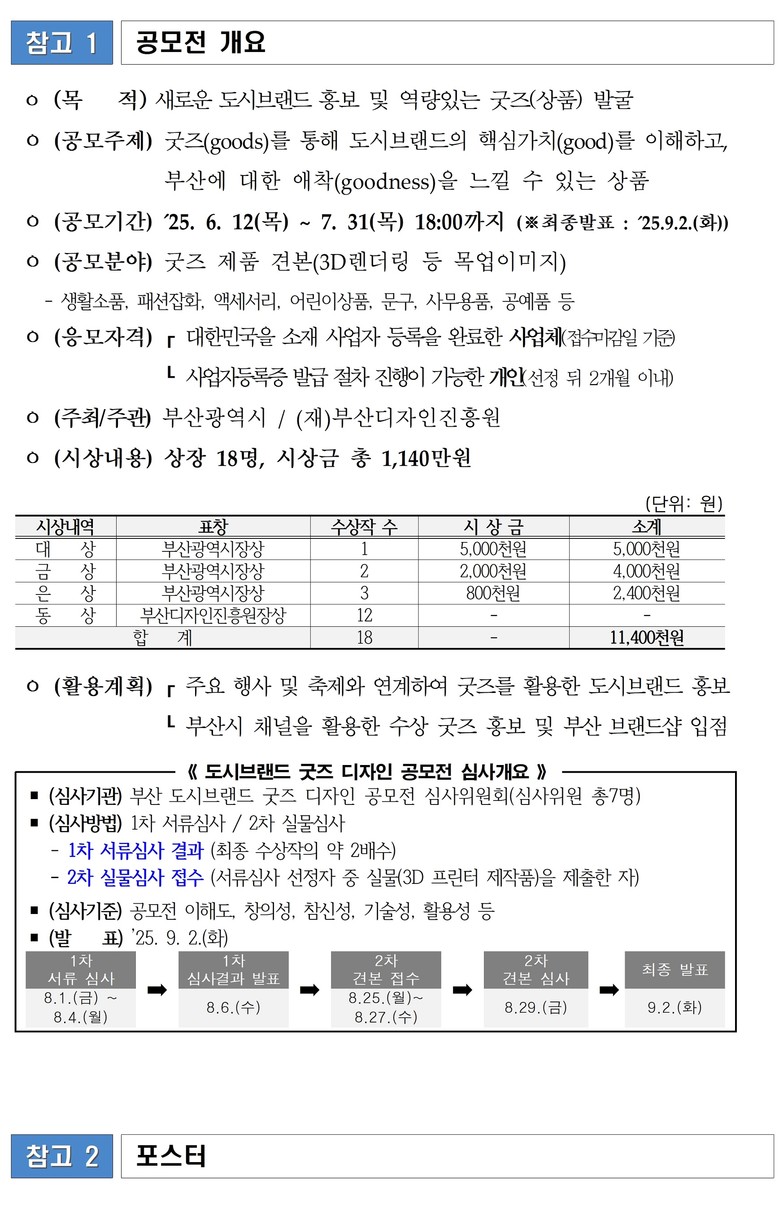 한편, 공모전에 대한 자세한 내용은 공모전 공식 누리집(busangoods.kr) 또는 시 누리집 고시공고(www.busan.go.kr/nbgosi), 진흥원 누리집(www.dcb.or.kr)에서 확인할 수 있다.
