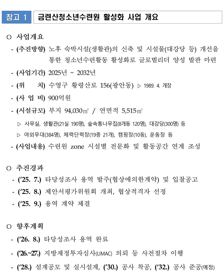 금련산청소년수련원 활성화 사업은 총 900억 원의 자금을 투입해 ▲2028년 설계공모 ▲2030년 착공 ▲2032년 준공을 목표로 하는 대규모 투자사업으로, 시는 내년(2026년) 8월 용역 완료 이후 지방재정투자심사 의뢰 등 사전절차 이행에 돌입할 계획이다.
