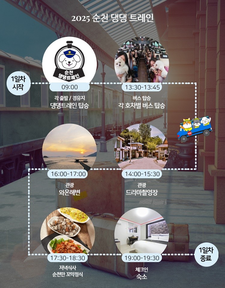 일정은 6월 14부터 15일까지 1박 2일로 운영되며 여행 코스는 ▲순천드라마촬영장 ▲와온해변 ▲아랫장야시장 ▲순천만국가정원(펫데이 특별개방) ▲오천그린광장 ▲낙안읍성 등 순천의 대표적인 반려견 동반 가능 관광지를 중심으로 구성됐다.