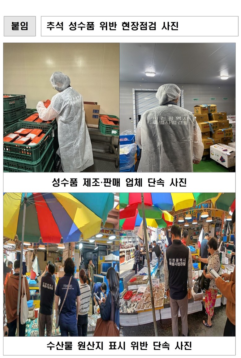 최종문 시 특별사법경찰과장은 “추석 성수품 불법 유통행위를 사전 차단해 시민 건강을 지키고 건전한 유통 질서를 확립하기 위해 이번 기획 수사를 추진했다”며, “앞으로도 안전한 먹거리 유통 환경 조성을 위해 선제적 관리와 수사를 지속하겠다”라고 밝혔다.