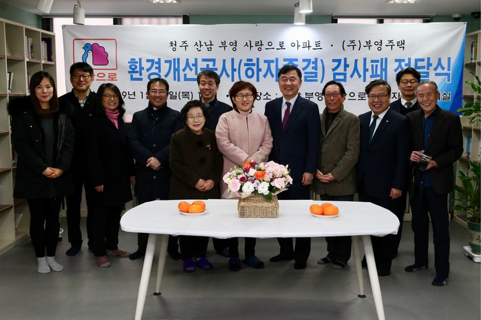 박미라 입주자대표회의 회장도 “청주 산남 부영아파트의 환경개선공사에 합의, 살기 좋은 아파트로 만들어 준 부영그룹에 감사드린다”며 “부영그룹의 아낌없는 지원과 성실 보수로 보다 살기 좋은 아파트를 만드는 데 기여해 감사의 뜻을 전달했다”고 했다.