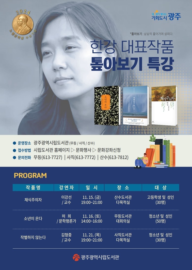 광주시립도서관은 이와 함께 한강 작가의 작품세계를 이해할 수 있는 대표작품 톺아보기 순회강연을 마련한다.