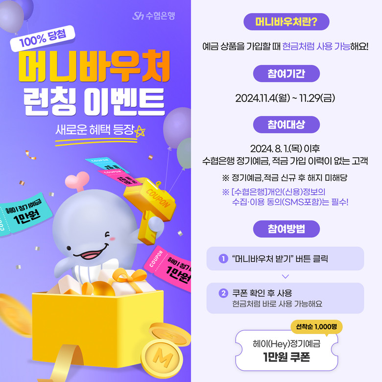 한편, 수협은행은 머니바우처 론칭을 기념해 모바일뱅킹 앱을 방문하는 선착순 고객 1천명에게 헤이(Hey)정기예금 가입시 사용할 수 있는 1만원권 쿠폰을 증정하는 이벤트를 진행한다.