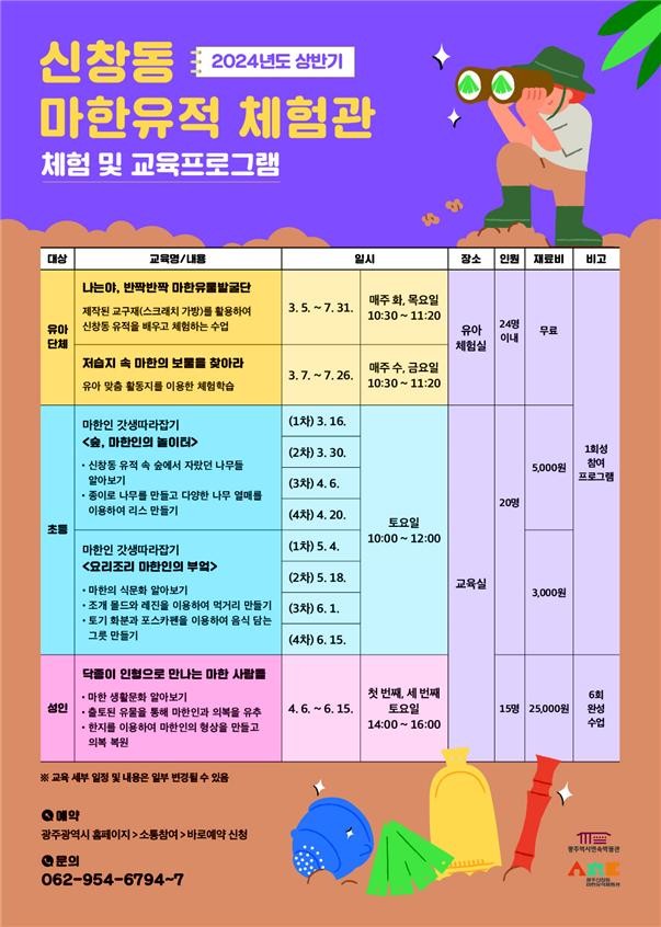 체험 및 교육프로그램 수강료는 무료이며, 재료비는 수강생이 부담한다. 신청은 광주시 누리집 바로 예약을 통해 하면 된다. 세부 일정과 자세한 내용은 역사민속박물관 홈페이지, 신창동 마한유적체험관 블로그를 통해 확인할 수 있다. 문의 : 062-954-6794
