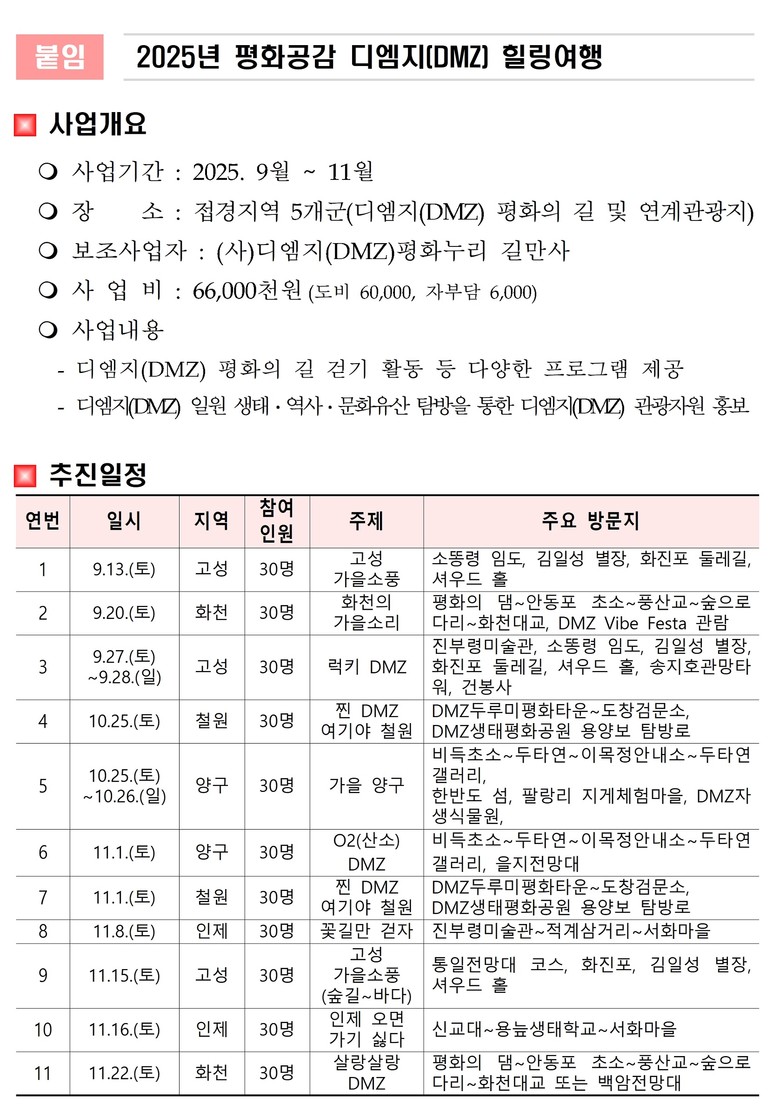 ‘디엠지(DMZ) 평화의 길’을 중심으로 주변 관광지를 연계한 ‘2025 평화공감 디엠지(DMZ) 힐링여행’도 9월부터 11월말까지 총 11회에 걸쳐 진행된다.