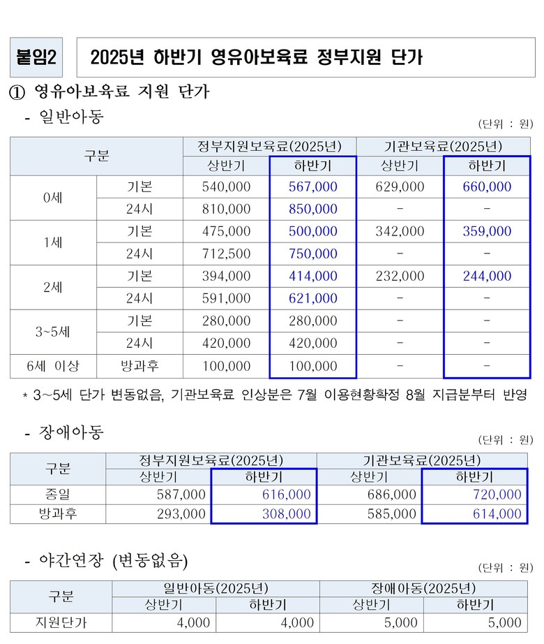 이번 인상은 상반기 단가 동결, 아동수 감소, 물가 상승 등으로 운영에 어려움을 겪는 어린이집의 현실을 반영, 운영 안정화와 보육서비스 질 제고를 위해 결정됐다. 인상액은 0~2세 아동은 2만~2만7000원, 장애아동은 2만9000원 수준이다. 인상된 수납한도액은 7월부터 적용된다.