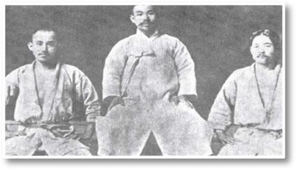 | ▲1910년 YMCA 유술지도자는 나수영 선생이며 이 사진은 왼쪽이 김홍식, 가운데가 나수영, 신원미상 일본인이 지도 받았다는 것은 조선의 최고 고류유술가였다는 것을 증명하는 사진이다. |