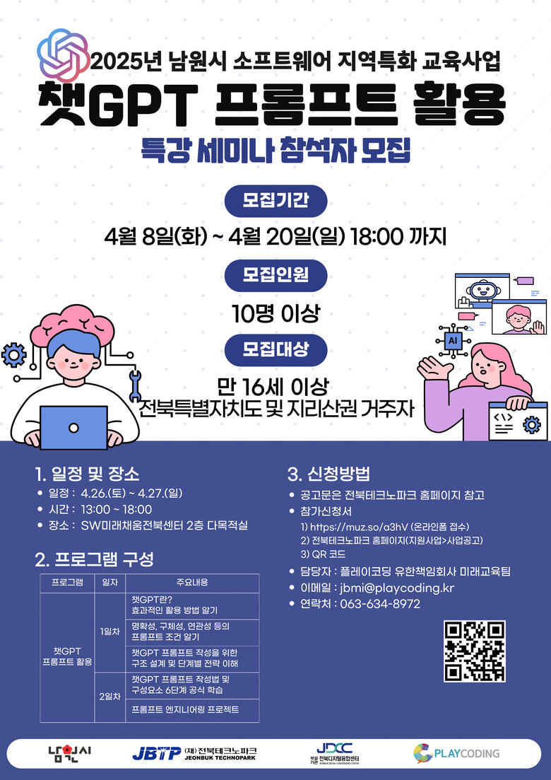 세미나는 4월 26일부터 2일간 SW미래채움 전북센터 2층 다목적실에서 진행된다. 교육은 강의와 실습이 병행되는 방식으로 진행되며 참가자들의 AI 실무 활용 능력 향상을 도울 예정이다.