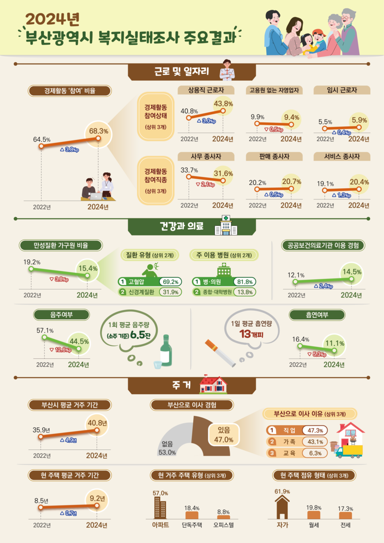 '2024년 부산광역시복지실태조사' 결과에 대한 자세한 사항은 시 빅(Big)-데이터웨이브 누리집(data.busan.go.kr) 통계자료실에서 확인할 수 있다.