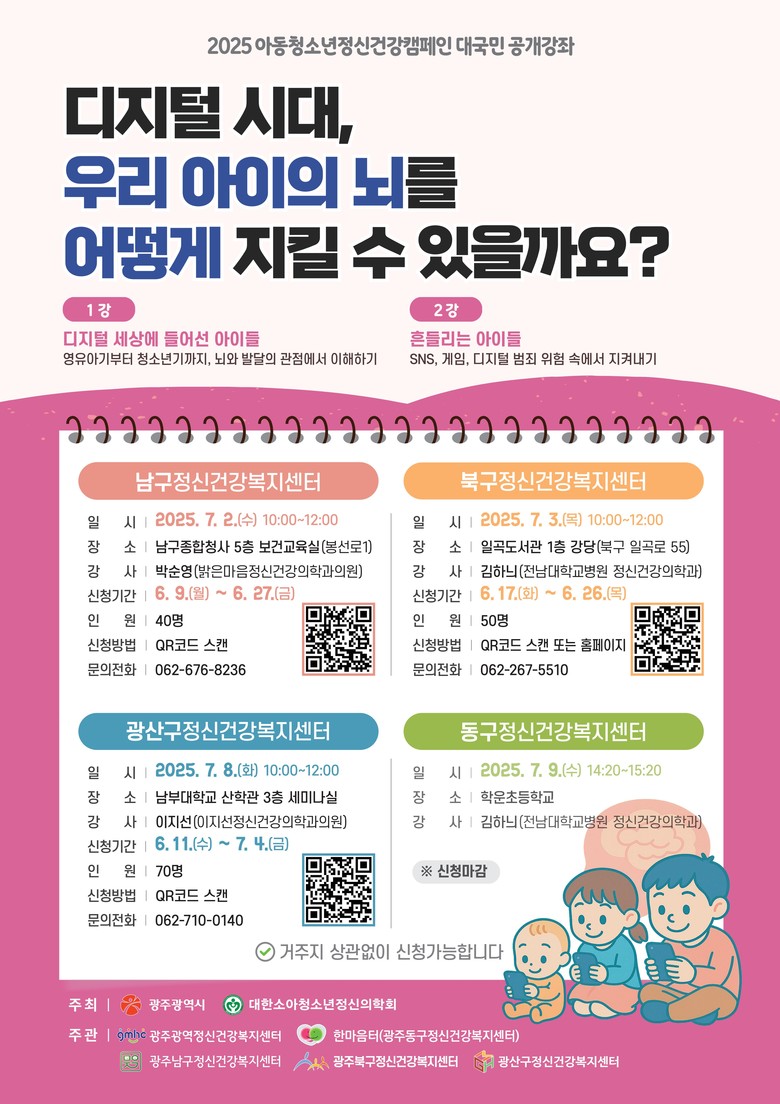 강좌는 오는 7월 2일부터 9일까지 총 4회에 걸쳐 열린다. ▲7월2일 오전 10~12시 박순영 정신건강의학과 전문의-남구종합청사 보건교육실(남구정신건강복지센터) ▲7월3일 오전 10~12시 김하늬 정신건강의학과 전문의-일곡도서관 강당(북구정신건강복지센터) ▲7월8일 오전 10~12시 이지선 정신건강의학과 전문의-남부대학교 산학관 세미나실(광산구정신건강복지센터) ▲7월9일 오후 2시20분~3시20분 김하늬 정신건강의학과 전문의-학운초등학교(동구정신건강복지센터)에서 진행된다.