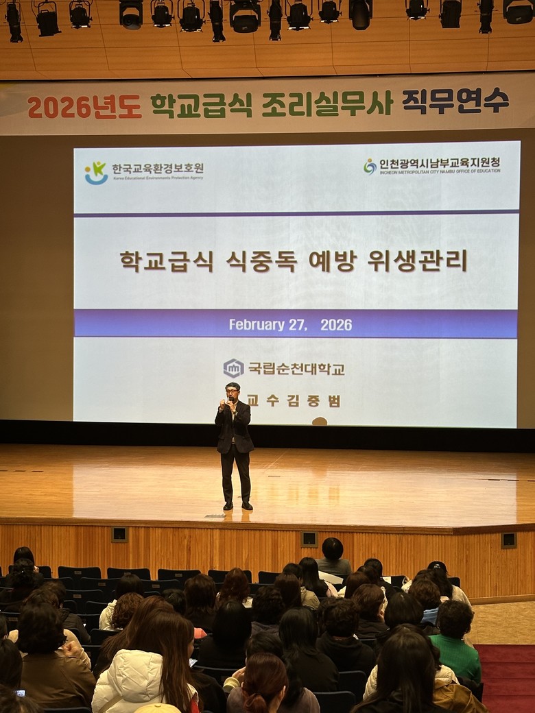 국립순천대학교 김중범 교수의 강의로 진행된 이번 연수는 학교급식 식중독 예방을 중심으로 현장에서 즉시 적용 가능한 위생 준수사항과 관리 방안을 중점적으로 다뤘다.