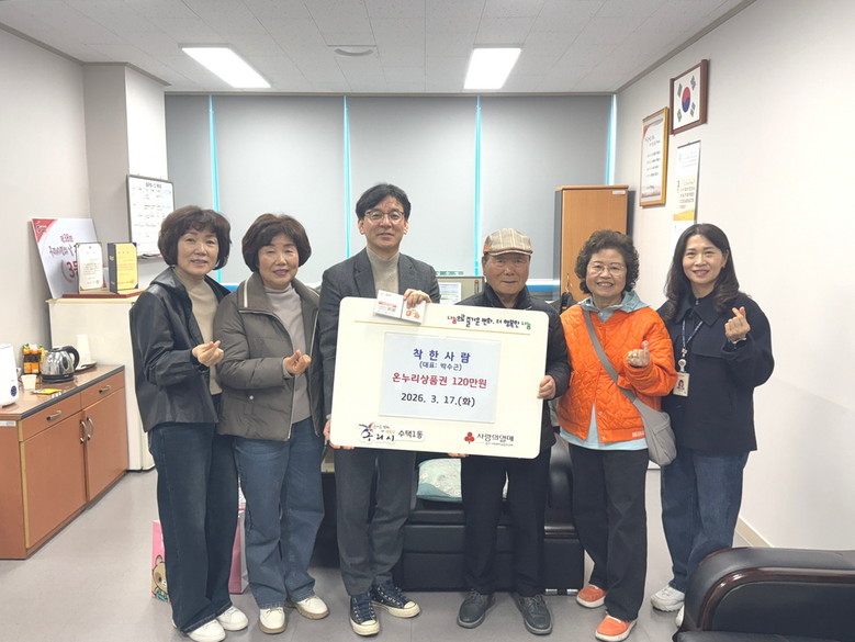 [구리시 세계타임즈=송민수 기자] 구리시(시장 백경현) 수택1동 행정복지센터(동장 김수영)는 지난 3월 17일 수택1동 나눔 모임 ‘착한사람’(대표 박수근)으로부터 온누리상품권 120만 원을 기탁받았다.