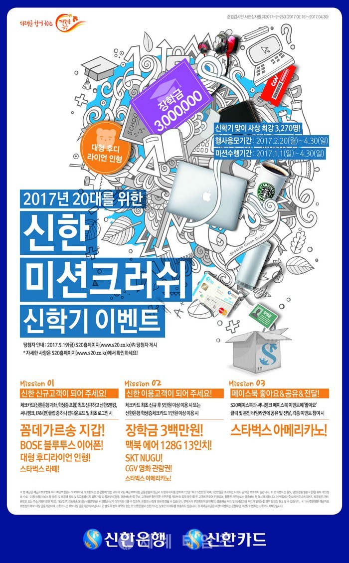 이번 이벤트 대상은 신한은행의 각종 금융미션을 수행한 후 신한S20 홈페이지 및 신한S20 페이스북을 통해 이벤트에 참여하신 20대 대학생 및 사회초년생(만19세~29세)이며, 추첨을 통해 20대가 선호하는 다양한 경품을 총 3,270명에게 제공할 예정이다.
