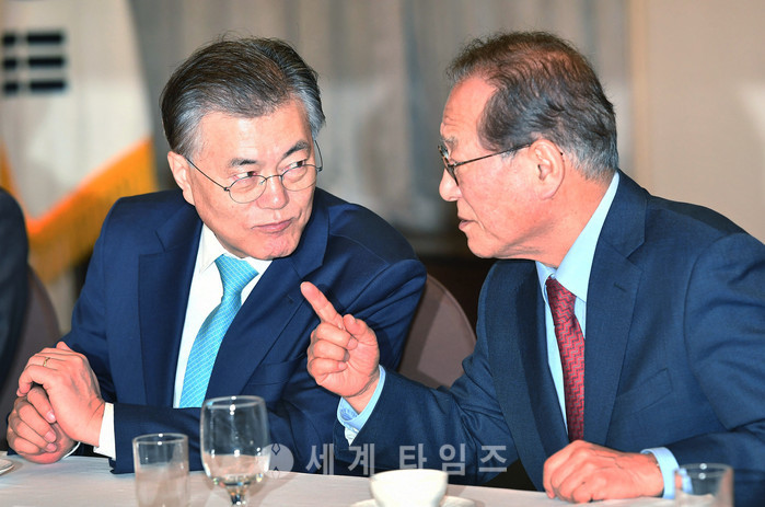 문재인 전 대표가 14일 오전 서울 중구 프레스센터에서 열린 '10년의 힘 위원회'에 참석해 공동대표인 정세현 전 통일부 장관과 대화하고 있다. '10년의 힘 위원회'는 국민의 정부와 참여정부 내각에 몸담았던 장·차관 60여명으로 구성된 문 전 대표 자문그룹이다. 2017.02.14.