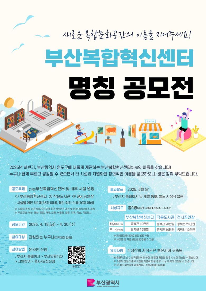 ◈ 공모 대상은 총 3개로, ▲'(가칭)부산복합혁신센터' ▲작은도서관 ▲전시공연장… 4.18.~4.30. 시 누리집을 통해 참여할 수 있으며, 공모 대상별 1인당 1개씩 제안 가능