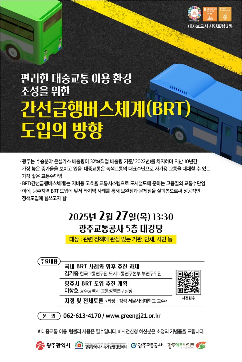 고광완 행정부시장은 “이번 포럼은 지역 여건와 환경에 맞는 간선급행버스(BRT) 도입 방향을 논의하는 자리”라며 “전문가와 시민들의 다양한 목소리를 광주시 교통정책 수립에 반영하겠다”고 말했다.