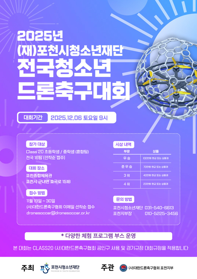 참가 대상은 클래스(Class)20 초등학생·중학생으로 구성된 팀이며, 혼합팀도 참여가 가능하다. 전국에서 총 16개 팀을 선착순으로 모집하며, 참가 신청은 11월 19일부터 30일까지 (사)대한드론축구협회 포천지부 이메일(dronesoccer@dronesoccer.or.kr)로 신청하면 된다.