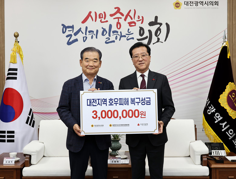 대전시의회는 올해 발생한 집중호우로 피해를 입은 주민들의 생활안정과 신속한 복구 지원을 위해 대한민국시도의장협의회로부터 재난구호금을 신청해 300만원을 지원받았다.