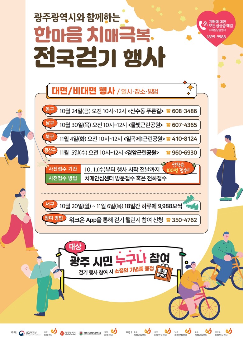 자치구별로 동구는 10월24일 푸른길분수공원에서, 남구는 10월30일 물빛근린공원, 북구는 11월4일 일곡제1근린공원, 광산구는 11월5일 경암근린공원에서 걷기행사가 진행된다. 행사 시간은 오전 10시부터이며, 치매 예방에 관심 있는 시민 누구나 무료로 참여할 수 있다.